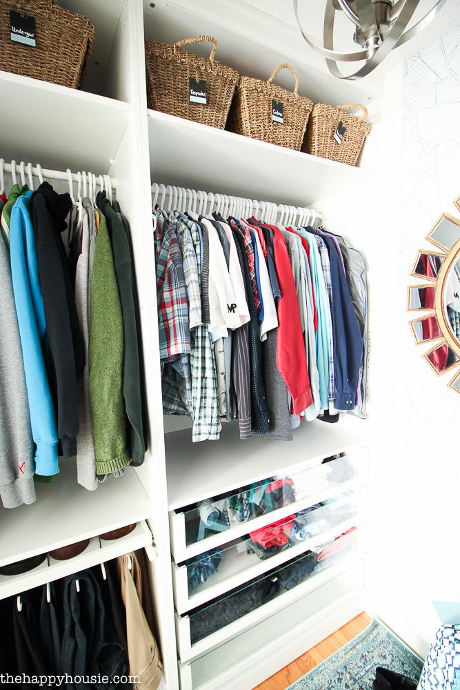 My husband loves that he has his own “side” on the closet…. he has so much space that he was able to get rid of his dresser in the bedroom and he still has an EMPTY drawer!! {I may just take that over eventually…}