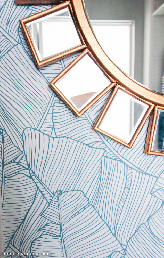 The lighting that I ordered for our closet is the perfect height (thankfully!) and I love the mix of silver and gold from the sunburst mirror against the crisp, beachy pattern of the wallpaper. And the rug is the same design as our large rug in our master bedroom – but in a 3×5 size.